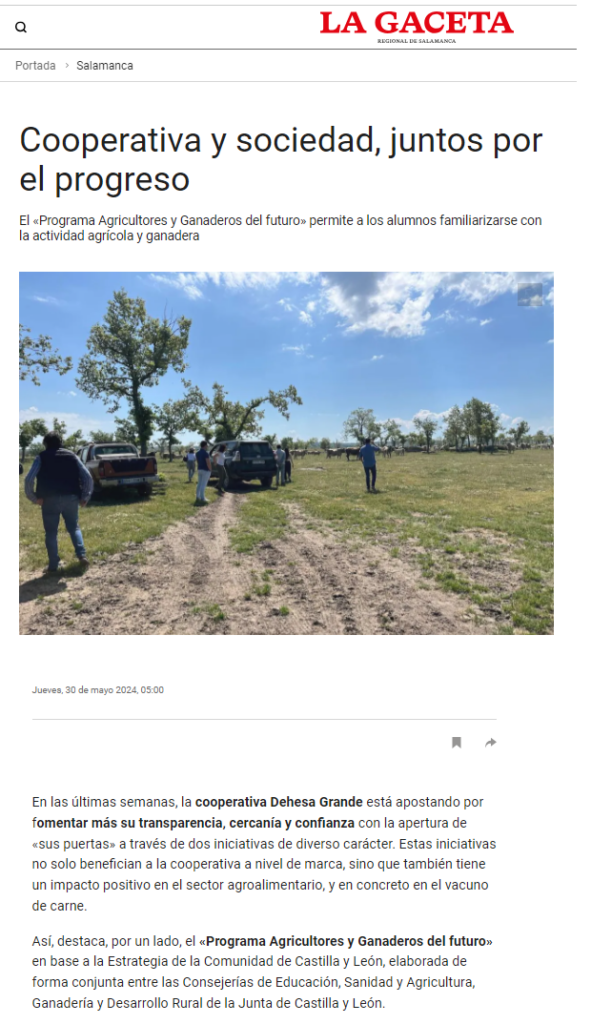 Nuestra cooperativa aparece en La Gaceta de Salamanca hablando de cómo está abriendo sus puertas a numerosas visitas con el objetivo de concienciar y visibilizar todo el trabajo que el sector de carne de vacuno realiza. Fomentar nuestra transparencia, cercanía y confianza.