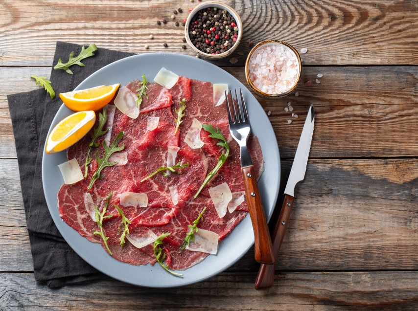Con un cuchillo muy afilado, corta láminas lo más finas posible. Dispón las láminas sobre un plato grande, formando una capa uniforme.