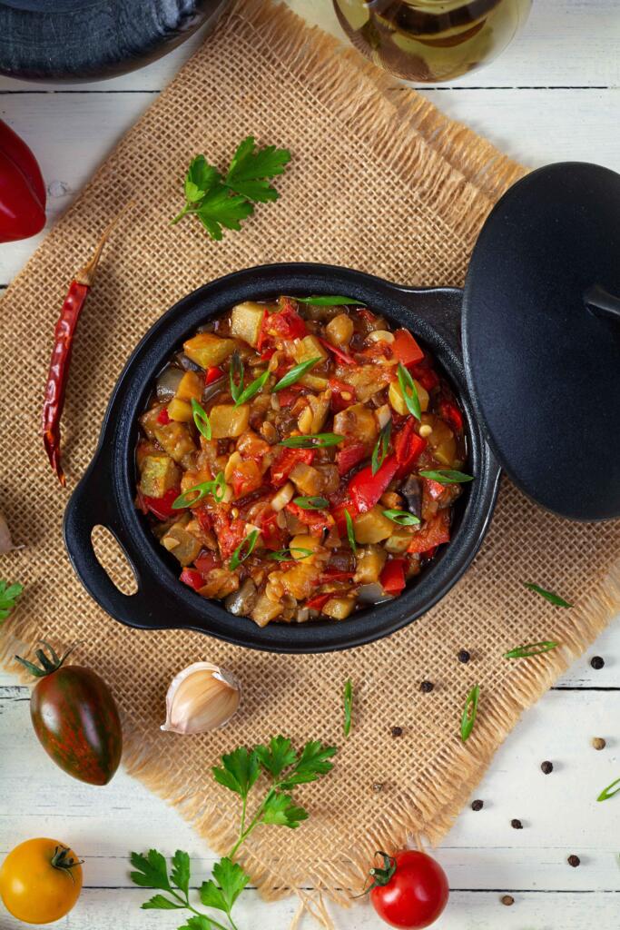 Lleva a ebullición, luego reduce el fuego a bajo, tapa la cazuela y deja cocinar a fuego lento durante 1.5-2 horas, o hasta que la carne esté muy tierna y las verduras bien cocidas. Remueve de vez en cuando y añade más caldo si es necesario.